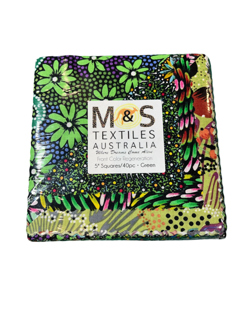 This 100% cotton print fabric that contains Australian Aboriginal Designs, comes with 40 pieces of 5" x 5" squares and contains different designs of Green color.