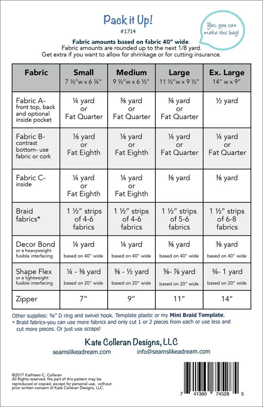 Instructions includes for bags in four sizes.