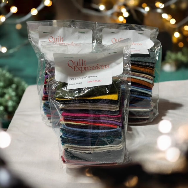 Each bundle contains (50) 3.5"x3.5" wool squares of miscellaneous colors of reds, blues, browns, yellows, tans, and blacks. We will pick a random package for you!